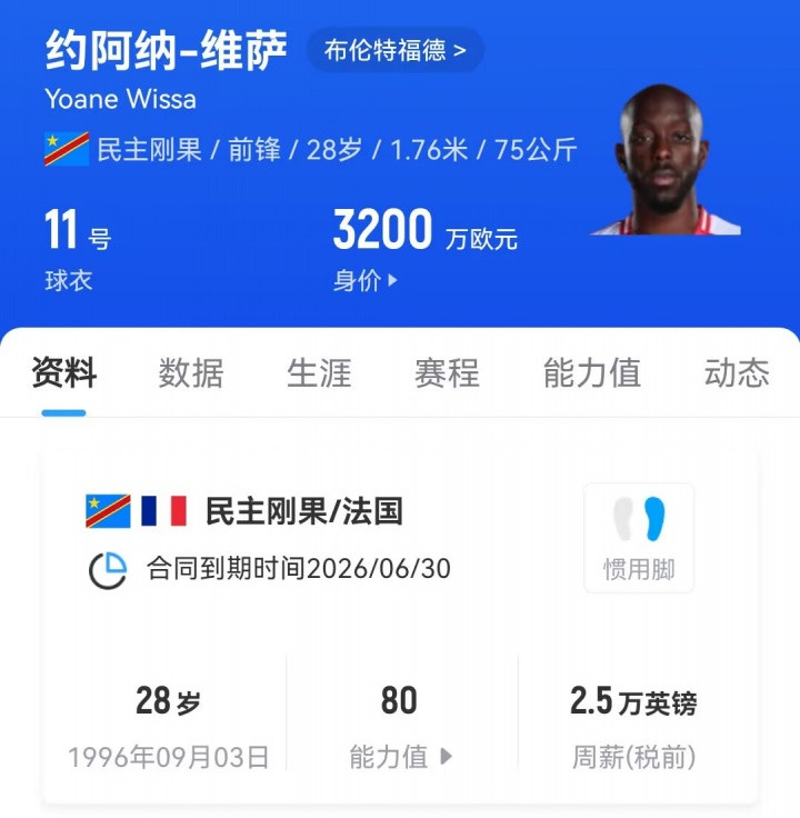 28岁的维萨目前的德转身价为3200万欧元,他与布伦特福德的合同将于明年到期。