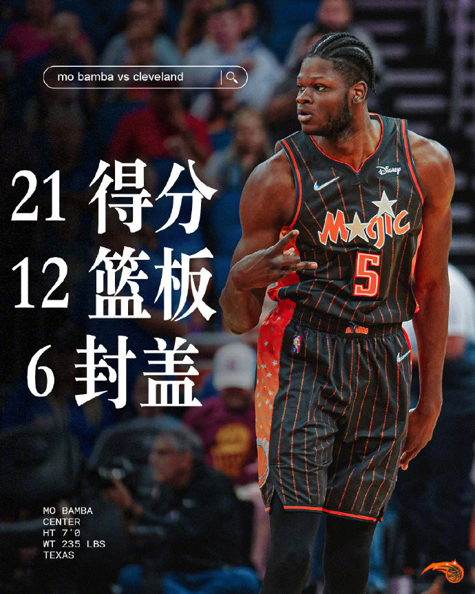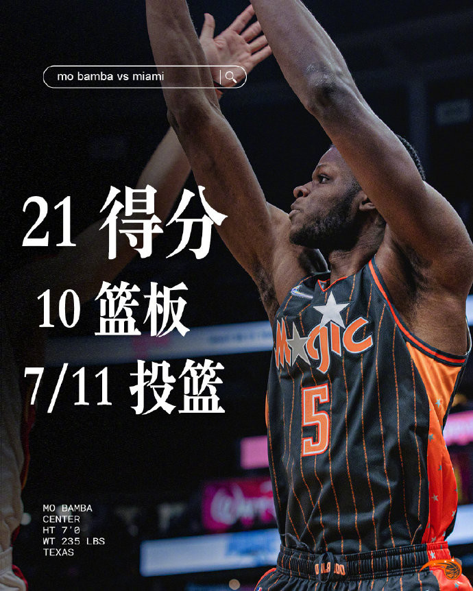 班巴的身体条件确实太好了,2米13的身高,2米39的臂展,运动能力出色,2018年NBA魔术队在首轮第6顺位选择了班巴。班巴是非常有潜力的,他可以抢篮板、防守,进攻端还有一手投篮,能投三分,这样运动能力出色、防守和进攻兼顾的中锋,在NBA很受欢迎的,但班巴只有在魔术队被重视,离开魔术队就处于流浪的状态。21-22赛季,班巴在魔术队场均出战25.7分钟,得到10.6分8.1篮板1.2助攻1.7盖帽,投篮命中率48%,三分命中率38%,场均可以命中1.5记三分。