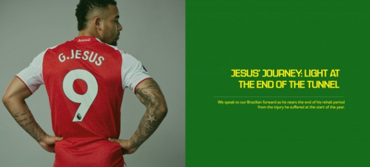 直播吧10月29日讯遭遇长期伤病的阿森纳前锋热苏斯已接近康复期的尾声,球员接受了阿森纳官网的专访。自一月份在足总杯对阵曼联的比赛中遭遇前十字韧带损伤后,热苏斯便一直缺席比赛。