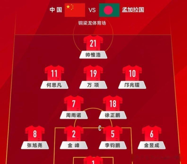 比赛伊始,中国队排出了4-2-3-1阵型。 帅惟浩担任单箭头,万项、何思凡和邝兆镭组成前卫线,徐正鹏和周雨诺搭档双后腰。